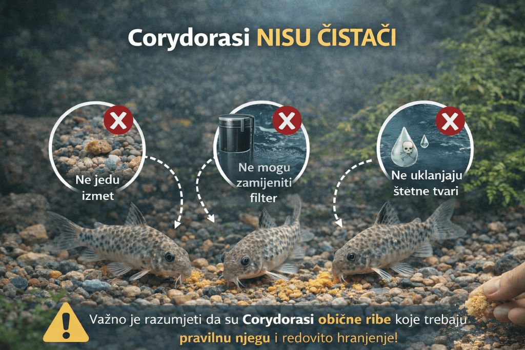 Naziv “čistači” dolazi iz njihovog ponašanja jer stalno pretražuju dno akvarija i jedu ostatke hrane koja padnu s površine. To često stvara dojam da čiste akvarij i održavaju ga urednim. Međutim, to je jedna od najčešćih zabluda u akvaristici. Corydorasi ne jedu riblji izmet, ne uklanjaju štetne tvari iz vode i ne mogu zamijeniti filter niti redovite izmjene vode. Oni mogu pojesti dio nepojedene hrane, ali to nije dovoljno da akvarij ostane čist. Ako nema ostataka hrane, Corydorasi neće imati što jesti i mogu oslabiti ili uginuti od gladi. Važno je razumjeti da su Corydorasi obične ribe koje trebaju pravilnu njegu i redovito hranjenje, a ne biološki “alat” za čišćenje akvarija.